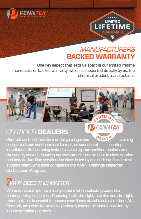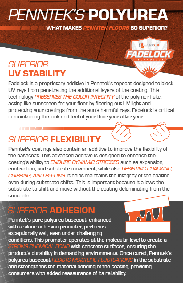 With the advantages of our Penntek flooring system, we are able to finish your project with a gorgeous finish that you will love for years! Unlike conventional flooring materials, Pennteks polyurea system offers incredible strength while being able to perform through extreme temperatures, impacts, abrasions, and chemical exposure!